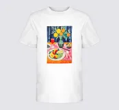 An elegant table set with a bowl of fruit, vibrant flowers and a wine glass creates a harmonious Mediterranean atmosphere. The contemporary painting and vibrant colours make this still life an eye-catcher in any room.