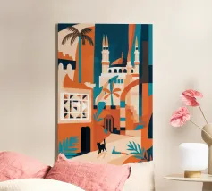 Een moderne abstracte compositie van verschillende gestileerde botanische vormen en bladeren in een palet van terracotta, beige en donkerblauw tegen een lichte achtergrond.