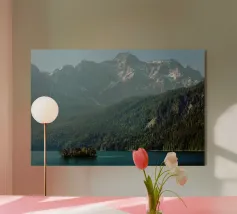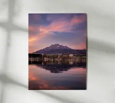 Een frisse lentedag aan de oevers van het meer van Thun, met de besneeuwde toppen van de Berner Alpen. Dit vredige landschap wordt gekenmerkt door rustig water, een charmant Zwitsers dorpje en majestueuze bergen onder een helderblauwe hemel. Vastgelegd met een Fujifilm-camera in natuurlijke tinten - ideaal voor kunstliefhebbers, reizigers en liefhebbers van alpiene fotografie.
