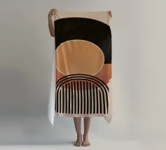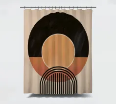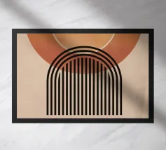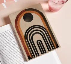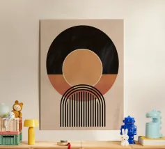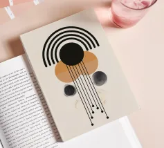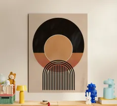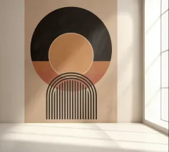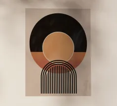 Dit moderne kunstwerk combineert duidelijke geometrische elementen met harmonieuze aardetinten. Een centrale cirkel in warm oranje en zwart wordt aangevuld met fijne, gebogen lijnen die dynamiek en diepte creëren. Het ontwerp wordt gekenmerkt door minimalistische elegantie en is perfect voor muurschilderingen, kussens of accessoires. Ideaal om een stijlvolle en tijdloze sfeer toe te voegen aan woonruimtes.