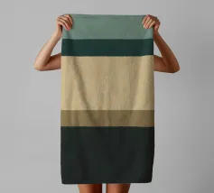 Een minimalistisch ontwerp met horizontale banden van verschillende kleuren. De compositie bevat tinten groenblauw, beige, bruin en zwart.
