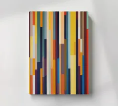 Het levendige abstracte kunstwerk toont gelaagde geometrische vormen in beige, blauwe en grijze tinten en creëert een dynamische en moderne visuele ervaring.