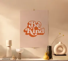 Dit opvallende ontwerp heeft retro-geïnspireerde oranje en witte letters op een zacht perzikkleurige achtergrond, waardoor een warm en uitnodigend visueel statement ontstaat. Perfect voor medelevende zielen, mindfulness enthousiastelingen en iedereen die een meer zorgzame omgeving wil creëren. Dit veelzijdige kunstwerk voegt een vleugje vintage charme en aanmoediging toe aan elke kamer. De nostalgische typografie en het rustgevende kleurenpalet zorgen samen voor een unieke esthetiek die zowel troostend als opbeurend is. Laat dit prachtige stuk dienen als een dagelijkse herinnering om vriendelijkheid te beoefenen en je omgeving te transformeren