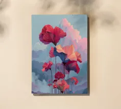Deze bloemencompositie, een gedurfde fusie van abstracte geometrie en organische zachtheid, vangt de essentie van een bloem in dynamische beweging. Overlappende doorschijnende bloemblaadjes in warm rood, koraal, oker en houtskool creëren een boeiend gevoel van diepte en stroming. De strakke beige achtergrond benadrukt de sculpturaal aandoende aanwezigheid van de stengel en bloem en biedt een harmonieuze balans tussen kleur en rust. Perfect voor moderne interieurs die op zoek zijn naar een artistieke knaller.