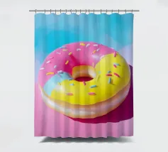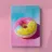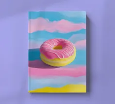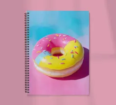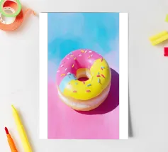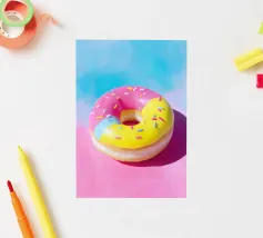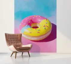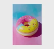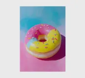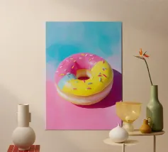 Felroze en gele donut met hagelslag tegen een pastelblauwe achtergrond. Digitale illustratie met olieverftextuur, gedurfde kleuren en zachte randen. Perfect voor vrolijke, moderne wanddecoraties of creatieve ruimtes.