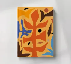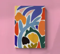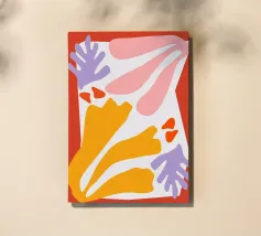 Heldere, abstracte vormen in warme tinten rood, oranje en geel zijn verweven met koele blauwe en zachtroze gedeelten. De compositie heeft gedurfde en vloeiende lijnen die een energiek en dynamisch visueel effect creëren.