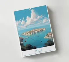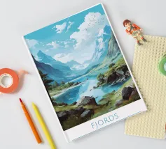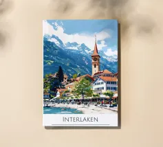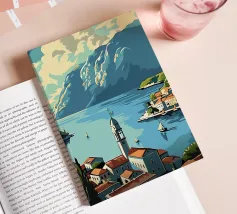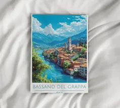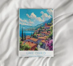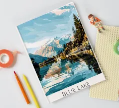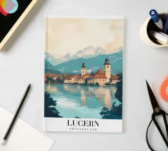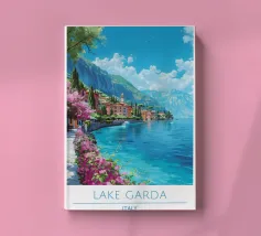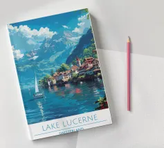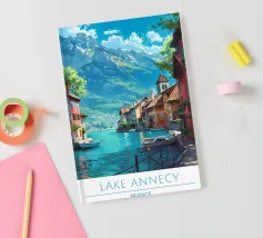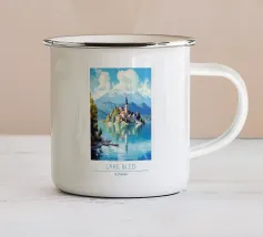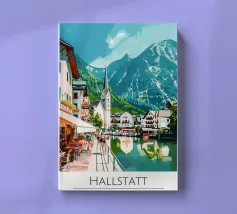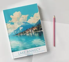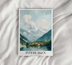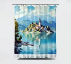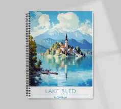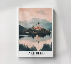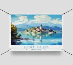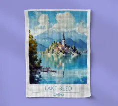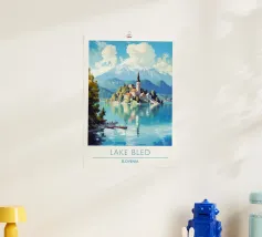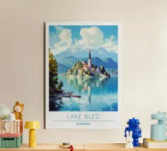 Ontdek het iconische sprookjeslandschap van het Meer van Bled, Slovenië, met deze prachtige digitale kunstprint. De afbeelding toont het beroemde eiland met zijn bedevaartskerk en gebouwen tegen de dramatische achtergrond van de Julische Alpen. Het levendige blauwgroene water weerspiegelt perfect het eiland en de met sneeuw bedekte bergen. Dit kunstwerk is weergegeven in een vloeiende, vintage reisposterstijl met een vleugje aquarel en legt de rust van de Alpen prachtig vast. Deze eersteklas digitale download wordt geleverd in een uitzonderlijke resolutie van 7000 x 5000 pixels bij 300 dpi, wat zorgt voor een superieure helderheid en levendige kleuren voor
