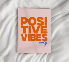Deze afbeelding toont een motiverende poster met de vetgedrukte tekst "GOOD VIBES ONLY" in fel oranje hoofdletters. De achtergrond van de tekst is licht groenblauw met een zachtroze rand. Onder de hoofdtekst staat de zin "FOCUS OP MENSEN IN JE LEVEN DIE JE POSITIVITEIT BRENGEN" in kleinere witte letters. Het algehele ontwerp is strak en levendig en maakt gebruik van contrasterende kleuren om een opvallende en opbeurende boodschap over te brengen. Deze poster promoot positiviteit en moedigt mensen aan om zich te richten op positieve invloeden.