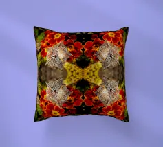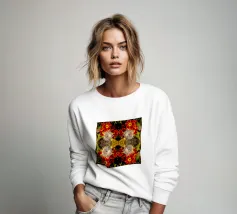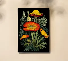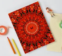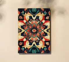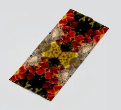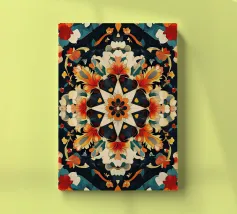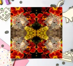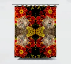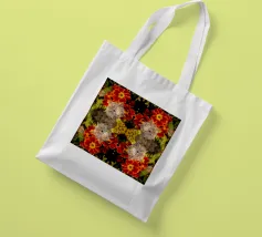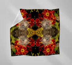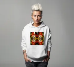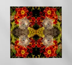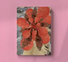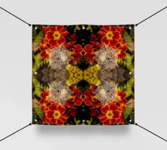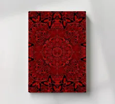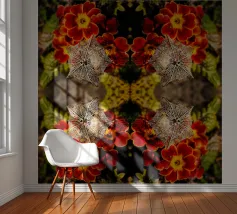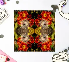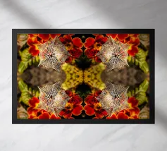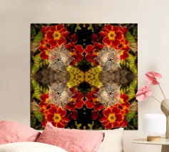 Een gespiegelde transformatie van een delicate rode bloem en groene bladeren, waardoor een betoverende symmetrische compositie ontstaat. Het doorschijnende vruchtenskelet lijkt op een mystiek masker, wat de afbeelding een buitenaardse charme geeft. Perfect als fine art print voor moderne interieurs, kantoren of ruimtes waar abstracte en op de natuur geïnspireerde kunst wordt gewaardeerd.