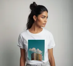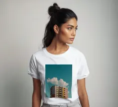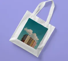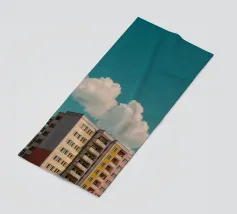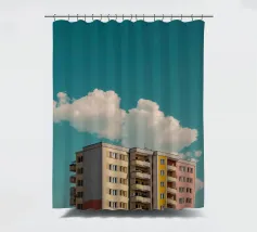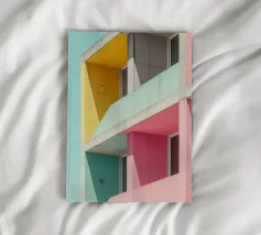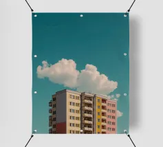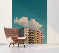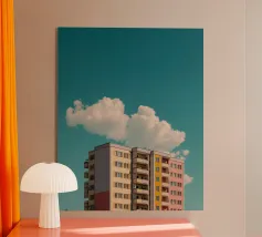 Verfraai je inrichting met deze fotografische poster die een stedelijk gebouw toont met kleurrijke, geometrische gevels onder een helderblauwe hemel, bedekt met katoenachtige wolken. Een trendy beeld dat moderniteit, zachte pasteltinten en een zomerse sfeer oproept. Perfect om een vleugje hedendaags, pop design toe te voegen aan je woonkamer, kantoor of slaapkamer.