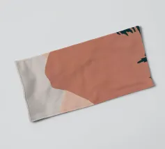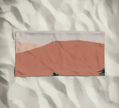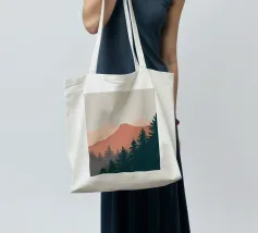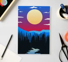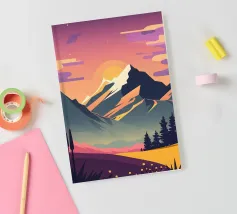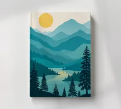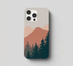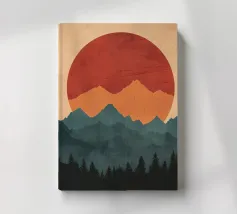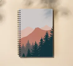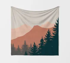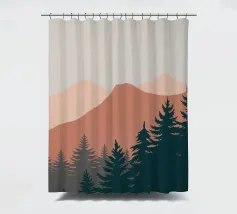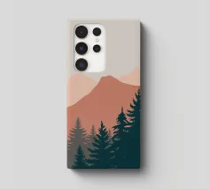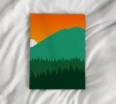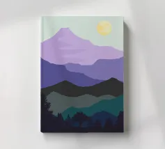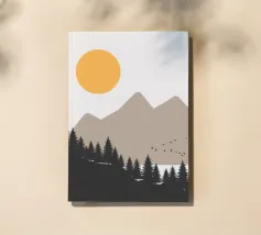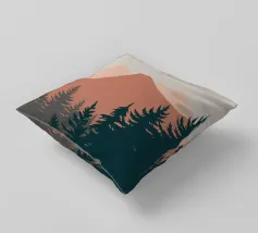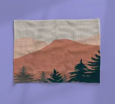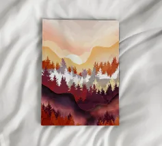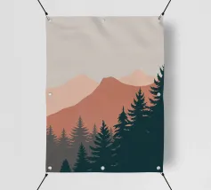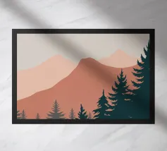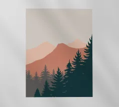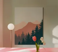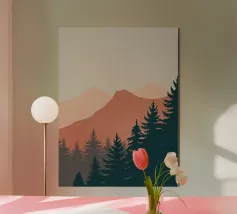 Gedempte tinten roze en grijs vormen een sereen berglandschap met silhouetten van pijnbomen op de voorgrond. De eenvoud en het kleurverloop creëren een vredige en kalmerende sfeer.