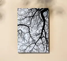De fijne takken en twijgen van een boom verschijnen als een donker silhouet tegen de blauwe lucht. Hun weerspiegeling creëert elegante structuren en een complex netwerk van takken. Een abstract droomlandschap van lucht, licht en schaduw wordt zichtbaar. Deze symmetrische compositie is gewijd aan de tijdloze schoonheid van bomen in de winter.