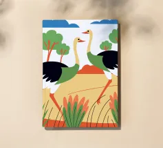 Geniet van een levendige wildillustratie met een zebra die door de savanne rent met wolken op de achtergrond.