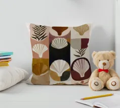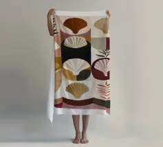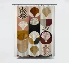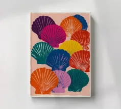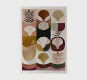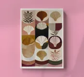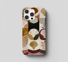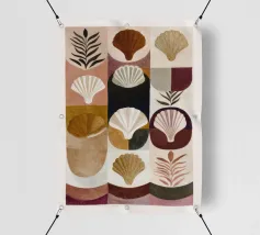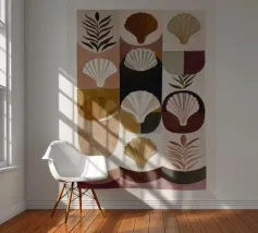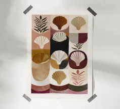 Een evenwichtige compositie met schelpen en organische vormen in warme aardetinten. Het werk toont een rustige harmonie door kleur en vorm.