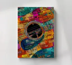 A modern abstract painting featuring geometric shapes forming guitars, violins, and musical notes in a bold, colorful composition. The textured background and dynamic arrangement evoke a sense of rhythm and artistic expression.