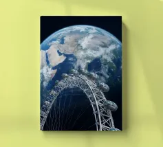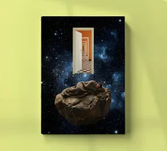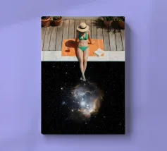 Dit surrealistische kunstwerk combineert een zonovergoten tropisch strand met een adembenemende kosmische twist, met een enorme planeet die boven dramatische woestijnkliffen uittorent. Een vintage-geïnspireerd koppel staat aan de kustlijn, starend naar een onmogelijke maar droomachtige horizon waar oceaan, land en ruimte botsen. Het contrast van warm zand, turquoise water en hemels blauw creëert een opvallende visuele balans die verwondering, romantiek en escapisme oproept. Perfecte muurkunst voor moderne interieurs, creatieve studio's of reisliefhebbers. Dit ontwerp spreekt fans aan van surrealistische landschappen, retro-esthetiek en fantasiekunst.