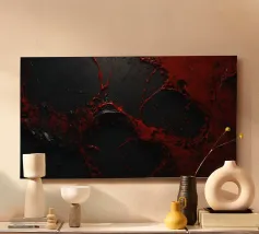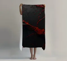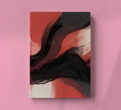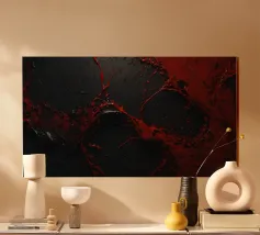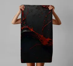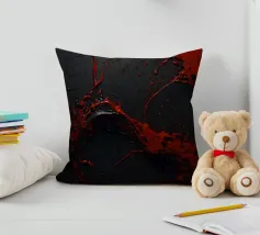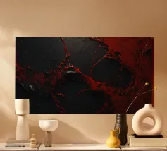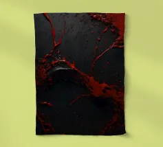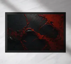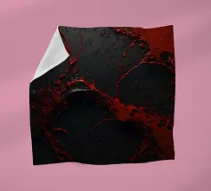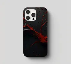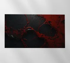 Felrode verf spat over een donkere achtergrond en vormt unieke patronen en vormen. Het contrast benadrukt de artistieke expressie en creëert visuele intrige.