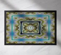 Ster met 5 punten met versierde vormen in groen-geel-blauwe kleuren.