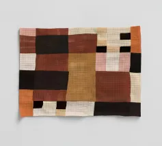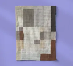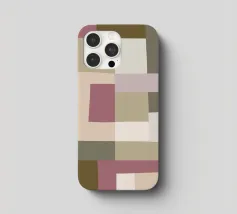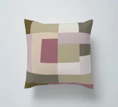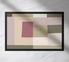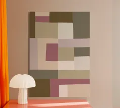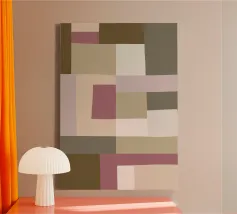Kleur blokkerende abstracte kunst. Organische rechthoeken met onregelmatige lijnen in olijf-, mauve- en crèmetinten vormen een opvallend color block kunstwerk voor moderne interieurs.