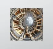 Deze afbeelding toont ingewikkelde cirkelvormige architectuur met sierlijke stenen zuilen, een centraal standbeeld en een glazen plafond. Het surrealistische perspectief creëert een tunnelachtig effect, waardoor het oog naar het midden van de compositie wordt getrokken.