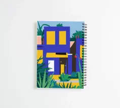 An illustration of a modern, blue and yellow building at night, surrounded by lush plants. The composition is cool, atmospheric, and has a stylish, contemporary, urban feel.