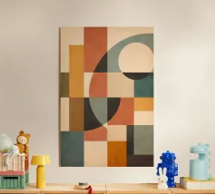 This abstract artwork blends modern clarity with vintage warmth through a composition of rounded geometric forms arranged in a loose grid. Overlapping shapes create gentle intersections, where transparency and color layering generate depth and visual rhythm. A muted palette of ochre, olive, terracotta, blush, and cream evokes mid-century design while remaining distinctly contemporary. Subtle surface texture adds a tactile quality, softening the structure. The piece balances order and fluidity, offering a calm yet engaging visual experience ideal for modern, minimalist interiors.