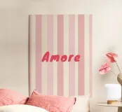 Soft pink and cream vertical stripes paired with the word “Amore” create a gentle, romantic design inspired by Italian sweetness and minimalist aesthetics. Warm, playful, and elegant, this artwork adds a cozy and modern touch to any space. Perfect for bedrooms, living rooms, kitchens, cafés, or interiors that love soft colors and simple, expressive typography.