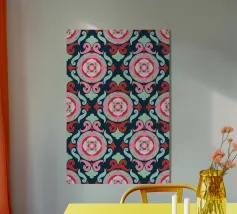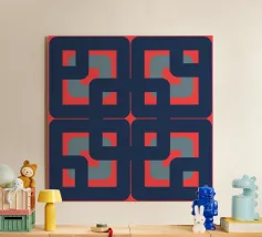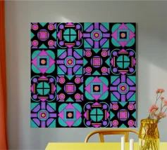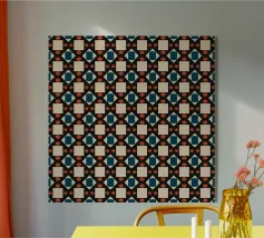 Dit grafische pijlpatroon kunstwerk heeft een moderne compositie van herhalende pijlen in verschillende kleuren die een gevoel van beweging en energie creëren. Het beperkte kleurenpalet creëert harmonie en het gebruik van pijlen symboliseert richting.