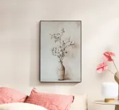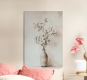 Deze stijlvolle illustratie toont een elegant boeket van delicate grassen en witte magnolia's in een minimalistische vaas die perfect past in een boho-stijl. De zachte pastelbeige tinten en botanische elementen geven het kunstwerk een mediterrane bloemenesthetiek die elk interieur zal verfraaien.