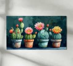 This cheerful poster features cute cactus plants in full bloom, set against a soft pink background that enhances its playful, feminine charm. Bright blossoms and rounded forms create a lighthearted, happy composition with a warm, uplifting feel. Its sweet, modern aesthetic makes it especially well suited for bedrooms, nurseries, home offices, and creative spaces, adding a touch of joy, color, and cute botanical style.