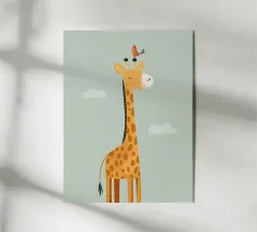 Een speelse en dromerige illustratie van een grote giraffe die oprijst boven een grillige lucht vol zachte, kleurrijke wolken. Het retro-moderne kleurenpalet in warm rood, geel en crème creëert een serene en fantasierijke sfeer - perfect voor een kinderkamer of een creatieve werkruimte. Gedrukt in hoge resolutie voor verbluffende details en visuele impact.