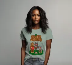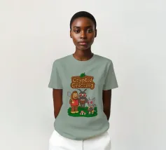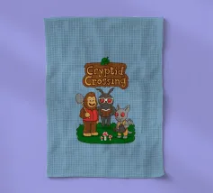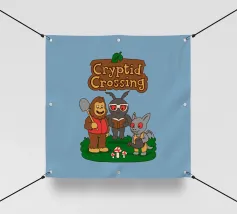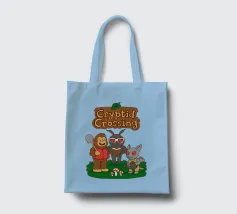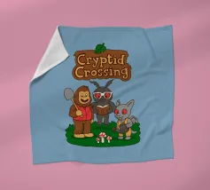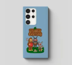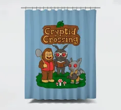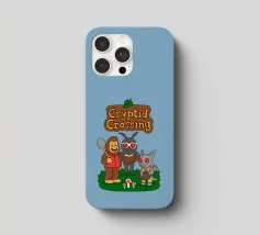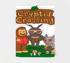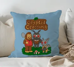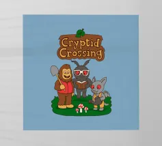 This illustration shows Bigfoot, Mothman, and an Ahool standing together on a grassy patch with mushrooms, all drawn in a soft and playful style. The artwork is a humorous parody that blends famous cryptids with the cozy, charming atmosphere of Animal Crossing, highlighted by the pun “Cryptid Crossing.” Perfect for fans of folklore, cute gaming aesthetics, and anyone who loves clever twists on iconic video game vibes.