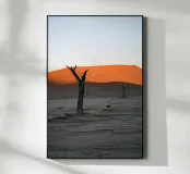 Elk duin, gevormd door de fluisterende wind, vormt gladde, gebogen richels die scherpe, elegante schaduwen werpen. Het oppervlak glinstert van de hitte en fijne zandkorrels dansen lichtjes over de top, gedragen door de bries. In deze stille, dorre wereld staan de duinen als steeds veranderende sculpturen - tijdloos, majestueus en mysterieus.