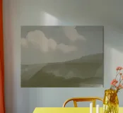 Soft, muted tones depict a serene landscape with rolling hills and a cloudy sky. The scene conveys a sense of calm and tranquility, with gentle gradients blending into one another.