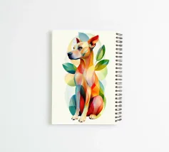 A vibrant artistic illustration of a sitting dog composed of overlapping geometric shapes in bold, multicolored tones, with abstract leaf elements in the background, creating a modern and eye-catching design.