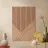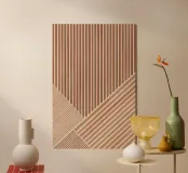 Striking geometric design featuring white parallel lines arranged in various orientations, creating triangular and trapezoidal shapes against a brown background, resembling a wooden texture.