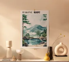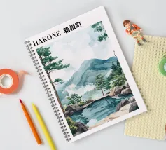 Het "Hakone"-ontwerp toont een schilderachtig berglandschap met onsen in Hakone, Japan, geïnspireerd op klassieke ukiyo-e en verfijnd met delicate aquarelelementen. Perfect voor fans van traditionele Japanse kunst en ontspannende momenten in de natuur!