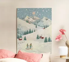 Minimalistisch winterlandschap met hut, bomen en skiërs.