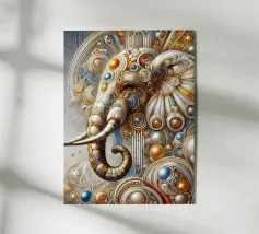Een uitgebreid geklede vrouw staat afgebeeld voor een olifant, omringd door roze lotusbloemen. Het tafereel straalt een gevoel van sereniteit en verbondenheid met de natuur uit en benadrukt culturele en spirituele elementen. Een vorstelijke vrouw versierd met juwelen zit sierlijk voor een majestueuze olifant, omringd door bloeiende lotusbloemen. Het tafereel straalt een gevoel van rust en kracht uit en weerspiegelt de harmonieuze relatie tussen mens en natuur. Isha, een oerkracht - stil, maar onwankelbaar. Niet luidruchtig, maar krachtig in haar aanwezigheid. Kracht rust in haar blik. Wild, wijs en mooi.