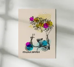 Een gele scooter staat geparkeerd voor een schilderachtig mediterraan landschap met citroenbomen, een zeilboot en een helderblauwe lucht, wat een gevoel van avontuur en ontspanning oproept.