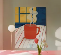 Een modern, abstract stilleven met een gestileerde plant in een blauwe vaas, een croissant en organische vormen onder een gele zon, alles in een evenwichtige, warme compositie.
