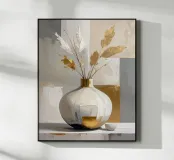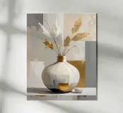 A quiet still life rises up between soft layers of grey and cream, like taking a deep breath. An arrangement with golden accents, reminiscent of quiet mornings, of moments when time expands and the world becomes quieter. This design celebrates the beauty of the unagitated: warm reflections, soft textures, quiet elegance. It speaks of harmony, inner peace and the power of small details to transform a home into a feeling.