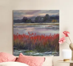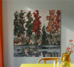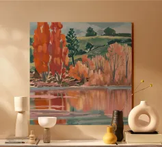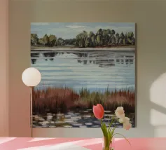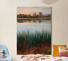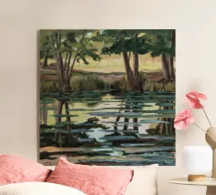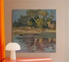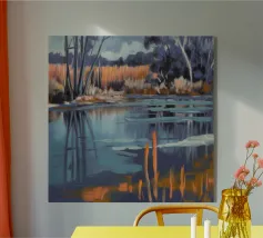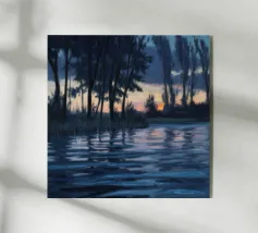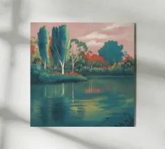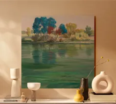 A quiet riverside scene where trees dance across the water in mirrored form. A lyrical landscape of balance and harmony.