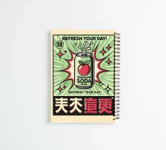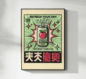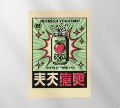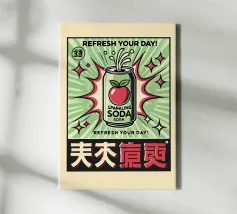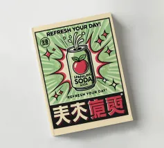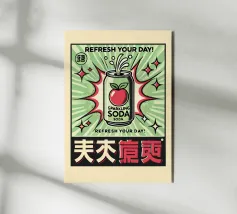A vibrant soda can bursts with energy against a background of dynamic green and red rays, surrounded by stars. The words "REFRESH YOUR DAY!" highlight the lively and uplifting theme, with bold text and striking colors.
