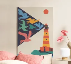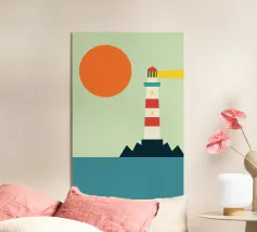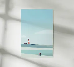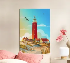 Dit modernistische kunstwerk presenteert de vuurtoren van Hörnum als een gedurfd en dynamisch bouwwerk, met de nadruk op scherpe hoeken en abstracte vormen. De vuurtoren, een balans tussen realisme en abstractie, is vereenvoudigd in opvallende rode en witte banden tegen een diepblauwe lucht en zand met textuur. Het samenspel van kleurvlakken en schaduwen in de compositie creëert een gevoel van diepte, waardoor het een eigentijds eerbetoon is aan het maritieme erfgoed en de kustschoonheid van Sylt.