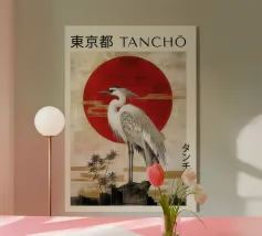 A poised crane stands on slender legs against a subtly textured parchment background, its ink-wash plumage rendered in delicate charcoal strokes. The bright red crown and fine calligraphic characters evoke classical East Asian scroll art. Printed on premium archival matte paper, every feather line and tonal nuance remains vivid over time. Ideal for entryways, dining rooms or meditation corners, this elegant print brings serene balance, cultural heritage and timeless grace to modern interiors.