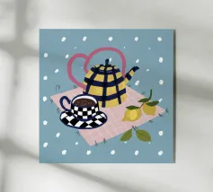 A cozy winter scene viewed from indoors, showing a teapot, a cup with a bird pattern, and a lemon slice on a windowsill looking out onto a snowy landscape.