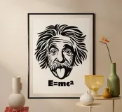 Albert Einstein is beroemd om zijn baanbrekende bijdragen aan de natuurkunde, in het bijzonder de ontwikkeling van de relativiteitstheorie. Het werk van de Duitse Nobelprijswinnaar revolutioneerde ons begrip van ruimte, tijd en zwaartekracht. Einstein gebruikte zijn roem om campagne te voeren voor vrede, internationaal begrip en sociale rechtvaardigheid. Hij was ook een door en door humoristisch en onconventioneel persoon, waardoor hij een populair cultfiguur werd. Laat zien dat je wetenschap en humor begrijpt met dit abstracte, minimalistische ontwerp.