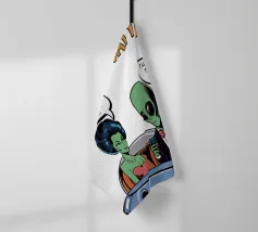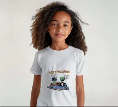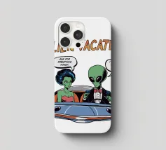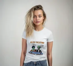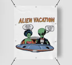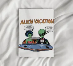 Twee cartoonaliens zijn afgebeeld op vakantie, waarbij de ene de weg vraagt en de andere antwoordt dat ze het bij de volgende gasreus zullen vragen. Ze zijn te zien in een vliegende schotel met de titel "ALIEN VACATION" erboven.