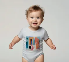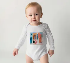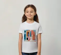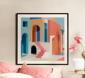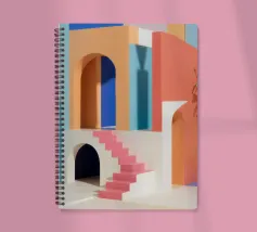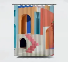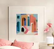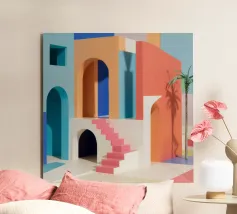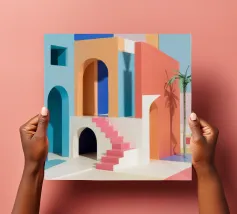 Een surrealistische architectonische compositie van bogen, trappen en deuropeningen in een zacht pastelpalet van roze, blauw en beige. Een eenzame palmboom voegt een vleugje natuur toe aan dit rustige en droomachtige labyrint.